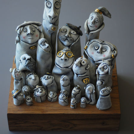 По-наблюдателните вероятно биха казали: ... но тук има 26 глави! Да, много исках да включа и образа на МАЙКАТА и чистото същество в образа на БЕБЕТО. Прецених, че с едно бебе, все още не разцъфнало като личност в настоящия живот, може да провокира мисли за Tabula rasa. Изразът “табула раза” описва идеята на Аристотел, че човек се ражда с празен и чист ум, означава чиста дъска. Разбира се, разиграх блясъка в хората с обичното ми златно лустро, което добре си партнира с неглазираната патинирана бяла глина. Харесвам контрастите в текстурите.